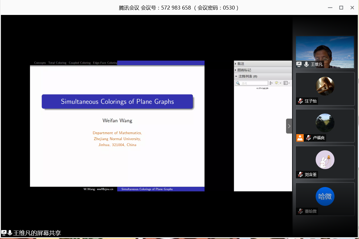 应我院邀请,5月30日上午,浙江师范大学王维凡教授在腾讯会议作了《Simultaneous Colorings of Plane Graphs》的报告。相关师生聆听了此次报告,报告由卢福良教授主持。