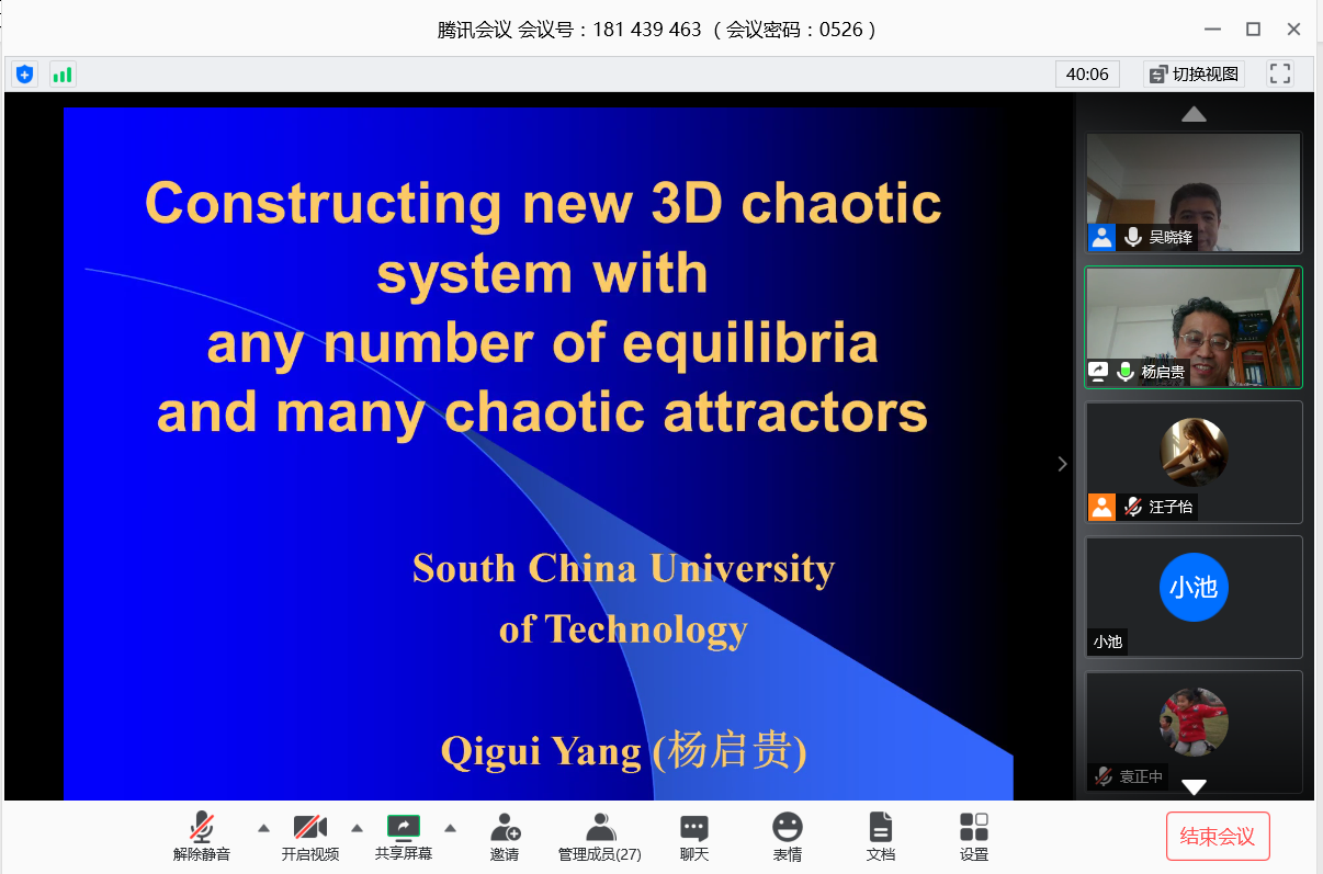 应我院邀请,5月26日下午,华南理工大学杨启贵教授在腾讯会议作了《Constructing new 3D chaotic system with any number of equilibria and many chaotic attractors》的报告。相关师生聆听了此次报告,报告由吴晓锋教授主持。