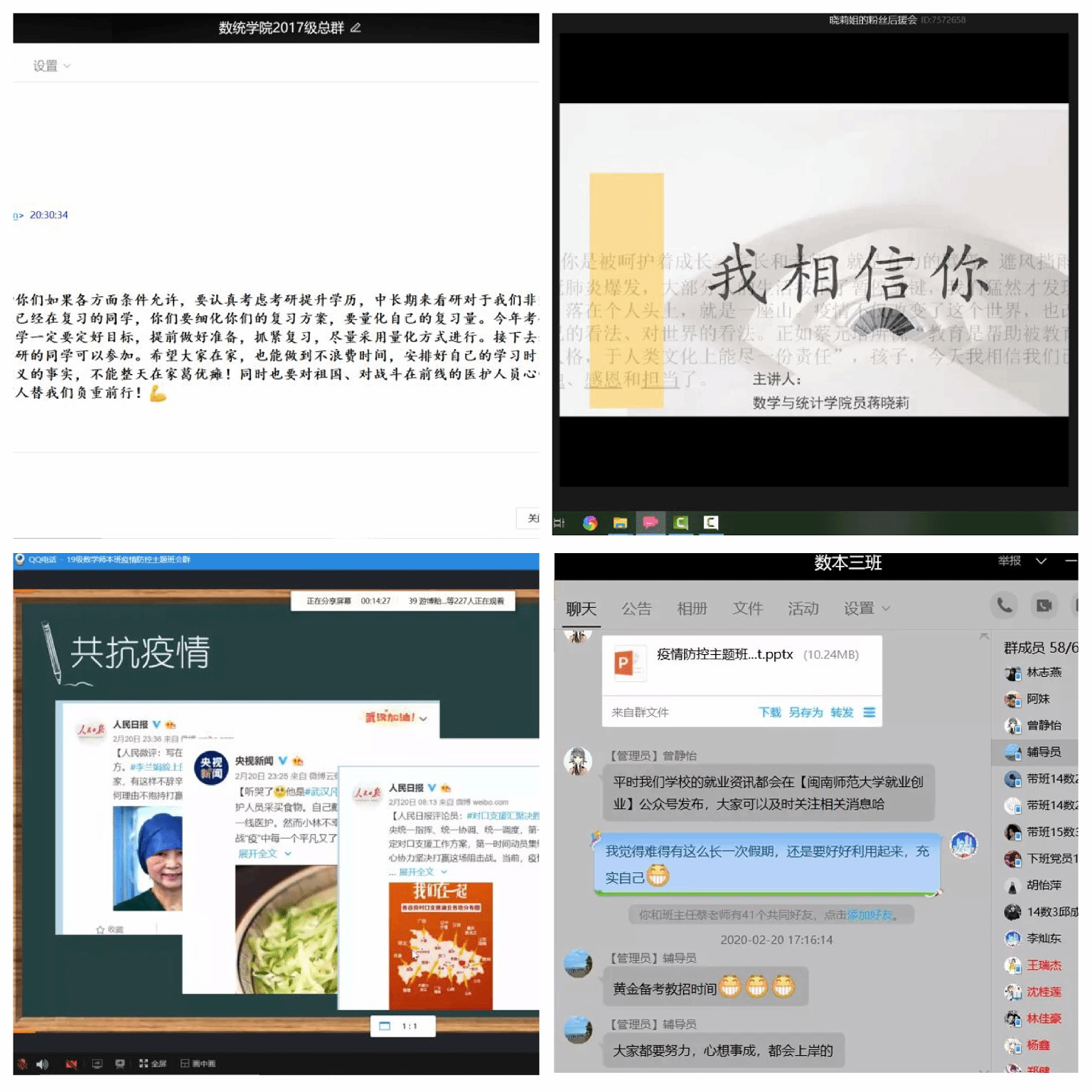 2019级辅导员许晴与张赫分别以“共抗疫情,学习不停”和“齐心抗疫情,宅家学习”为主题为2019级的同学们开展班会课。两位老师均组织同学们了解抗击心冠肺炎的有关情况,倡议同学们同心抗疫,并敦促同学们在疫情期间自觉学习。此外,许老师建议同学们如若出现心理不适情况,可以向学院老师或校心理咨询中心咨询。