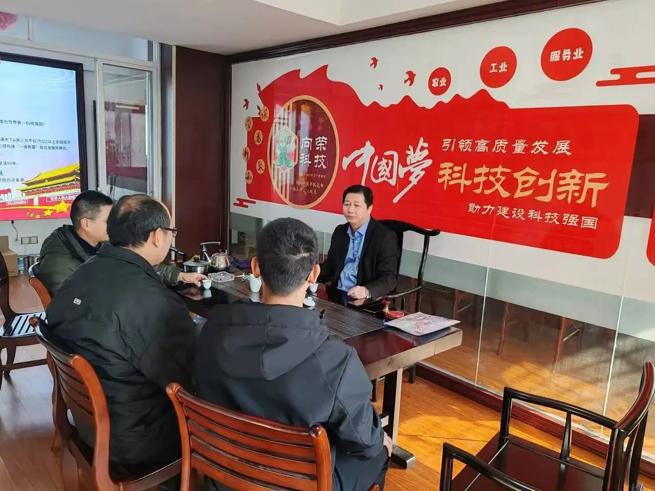 在漳州向荣信息科技股份有限公司,林海泽总经理系统介绍了公司的目标定位、业务范围、技术优势、人才队伍建设等方面。黄韩亮详细介绍了学院的发展历程和永利集团情况。随后,双方就学生实习就业、产学研融合发展等方面进行了深入讨论。
