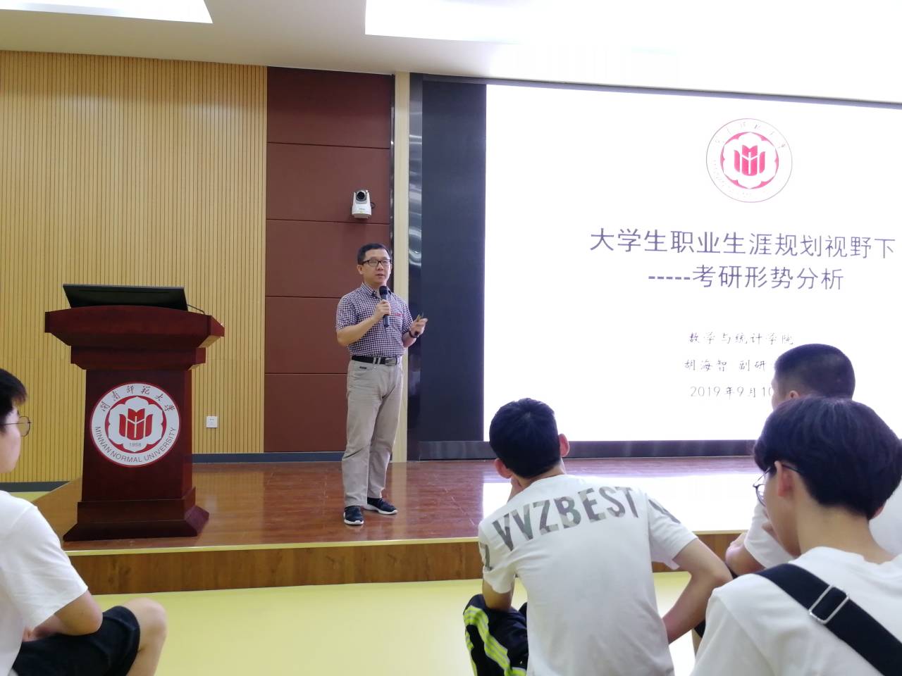 9月10日下午,学院副院长胡海智在砺志楼120为新生开展关于大学生职业规划视野下考研形势分析讲座。胡海智通过图表对近年来高校扩招,我国即将由高等教育大众化阶段进入普及化阶段的现状进行全面的介绍,深入分析了考研人数持续增长考研形势。并对全日制与非全日制学习方式、学术硕士与专业硕士的区别、推免生政策、研究生奖助政策、yl6776永利集团专业分类、专业选择以及研究生入学考试科目、专业复习等方面进行详细讲解,鼓励广大新生要发扬高考拼搏进取的精神,尽早确立自己的人生规划和目标,早定位、早复习,形成良好的学习习惯,营造浓厚的学习氛围,为目标不懈奋斗。