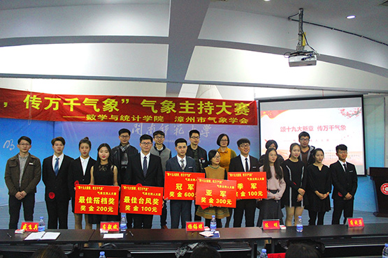 12月28日下午,由漳州市气象协会、yl6776永利集团团委联合主办,数统学院艺术团、青年志愿者中心承办的的“颂十九大新章,传万千气象”——气象主持人大赛在达理活动中心三楼报告厅圆满落幕。气象台副台长杨锡琼女士、工程师庄毅斌先生、漳州气象台主持人盛飞兵先生担任本次评委,数统学院团委书记、辅导员、各学院组织代表出席本次活动。