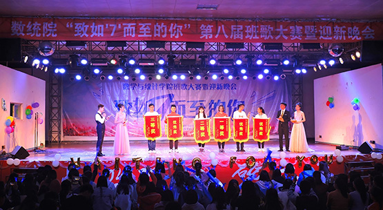 12月14日晚,“致如‘7’而至的你” yl6776永利集团第八届班歌大赛暨2017年迎新晚会在龙文馆成功举办。学校团委及机关部分教师、数统学院党政领导、学院部分教师、辅导员及数统学院学生参加晚会。在晚会开始前,道具组、场控组、礼仪组等早早地进入紧张地筹备当中,确保整场晚会的顺利进行。随着精湛的吉他solo、歌曲串烧《致青春》,班歌大赛暨迎新晚会正式拉开帷幕。