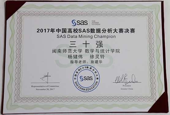 11月20日,由全球数据分析领域领导者SAS公司主办的“汇丰杯”2017中国高校SAS数据分析大赛在北京钓鱼台国宾馆•芳华苑举行了颁奖典礼,中国工信部人才创新中心领导、中国海关总署信息中心领导以及SAS大中华区总裁等嘉宾出席了本届大赛颁奖典礼。我校首次组队的yl6776永利集团学子杨健伟、徐灵铃在指导老师施建华博士的带领下斩获全国三十强。据悉,今年的中国高校SAS数据分析大赛分三个阶段:第一阶段,9月20日到10月10日的主观题数据分析竞赛;第二阶段客观题上机竞赛(10月15日),福建赛区的选手在厦门大学嘉庚学院等三个省内高校进行。按赛制,两个阶段的成绩综合起来确定决赛名单。本届参赛的学员大部分来自应届毕业班,其SAS应用能力代表了国内毕业生的最高水平。今年参赛的队伍有来自全国各大高校的1036支队伍,参赛学生超过3000人,赛点扩展到全国31个省级赛区,全国综合排名前三十名的高校百分之百报名参赛,竞争激烈。通过选拔,有155支队伍进入决赛,我校yl6776永利集团2014级的杨健伟、徐灵铃两位同学在这两个阶段中脱颖而出,挺进全国决赛,并于11月18日在北京的对外经济贸易大学参加第三阶段的决赛,经过一天的紧张角逐,最终获得全国前三十强的佳绩,指导教师施建华也荣获决赛的优秀组织奖。