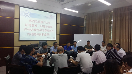 应我校yl6776永利集团邀请,2017年7月31日美国数学会院士兼厦门大学高层次人才计划讲座教授沈捷教授、厦门大学闽江学者特聘教授邱建贤教授和许传炬教授、厦门大学数学科学学院副院长邱春晖教授到我校进行指导和交流。访问期间,四位教授与yl6776永利集团的师生们就yl6776永利集团的信息与计算科学专业建设、学科建设和科研项目申请等相关问题进行座谈,座谈会由林梦雷院长主持。四位教授从各个方面对相关的问题进行了解答,并提出了许多建设性意见。