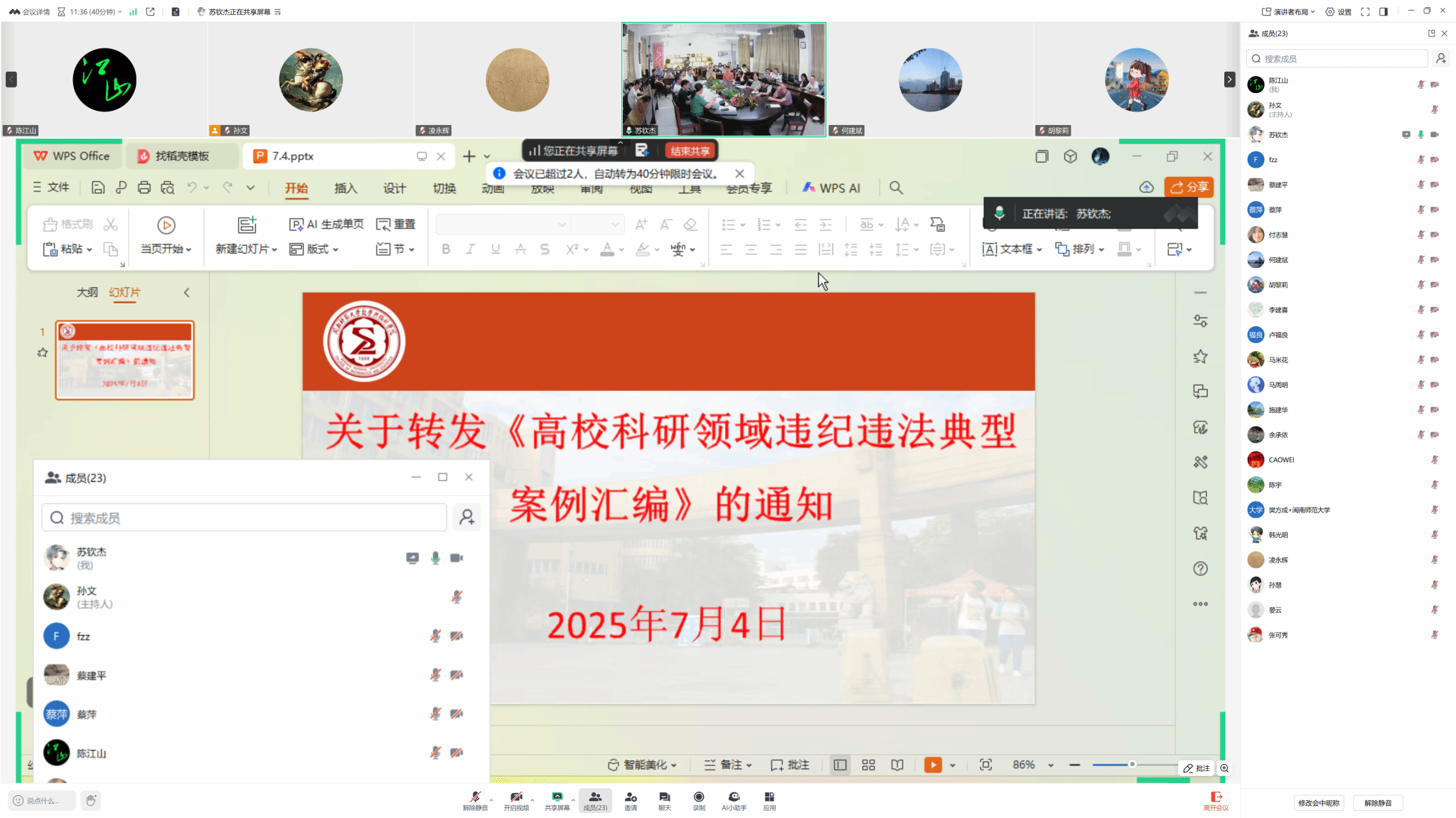 为深入贯彻党中央、省委党的建设工作领导小组会议和《中共中央办公厅关于在全党开展深入贯彻中央八项规定精神学习教育的通知》精神,2025年7月4日上午yl6776永利集团在砺志楼114召开全体专任教师会议,学习《关于转发<高校科研领域违纪违法典型案例汇编>的通知》。会议由黄韩亮院长主持,采用线上线下相结合的方式进行。林国平副院长在会上为大家宣读《yl6776永利集团科研诚信建设与学术不端行为处理办法》,研读了《高校科研领域违纪违法典型案例汇编》,通过深入剖析一系列科研不端行为的典型案例,引导学院科研人员以案为鉴,警钟长鸣,真正做到心有所畏,守住纪律底线,铸牢廉洁意识防线,强化规则意识,严格规范学术行为,共同营造学院科研工作的清廉新气象。