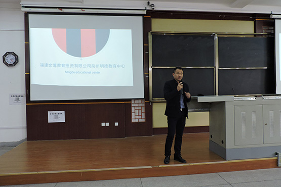 12月15日下午3:00,福建金帝集团旗下教育品牌福建泉州外国语中学、福建泉州明德教育中心专场宣讲会在砺志楼120顺利举行。泉州明德教育中心校长郭文峰、泉州外国语中学招师办公室主任杜增产作为主讲人出席本次宣讲会。yl6776永利集团、物理与信息工程学院、化学与环境学院以及外国语学院部分13级学生积极参与。
