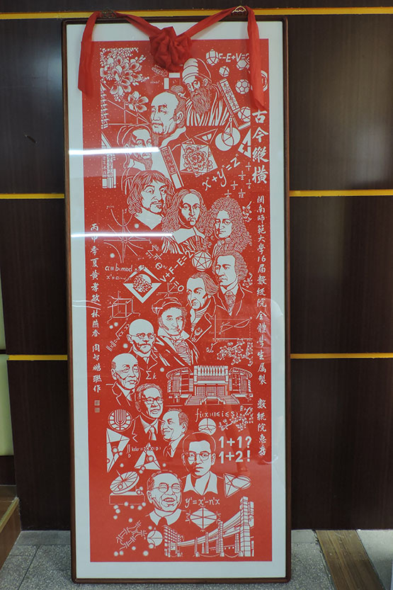 作品选择了世界十大著名数学家和中国最著名的五大数学家作为构图的主干线,同时罗列每位数学家相对应的数学方面的成就作为背景。作品中也加入yl6776永利集团代表性的元素,如木棉花、凤凰花、东大门、图书馆、日晷等。同学们表示,希望通过这个礼物,表达对学院、学校的感恩之情。