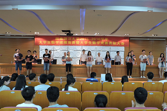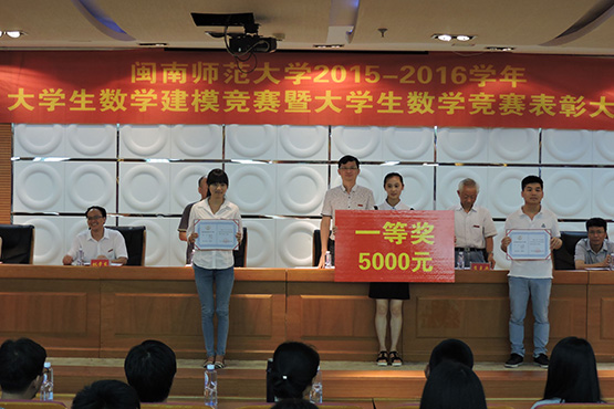 本学年我校积极组织学生参加数学类竞赛并获得丰硕的成果:参加全国大学生数学建模竞赛获得国家一等奖1项、二等奖3项、省一等奖4项,省二等奖3项;参加全国大学生数学竞赛共获得2个省赛区一等奖,1个二等奖,8个三等奖;同时,分别有14、24位同学获得第一届福建省大学生数学竞赛一、二等奖。2015-2016学年我校首次荣获全国大学生数学建模竞赛一等奖,取得了历史性的突破;获得全国大学生数学建模竞赛一等奖的同学陈斯湘、黄林香、王文琪分别来自数统学院和计算机学院,指导老师是商学院的刘建华副教授,竞赛组打破学科限制,促进了不同学院间的交流和融合。