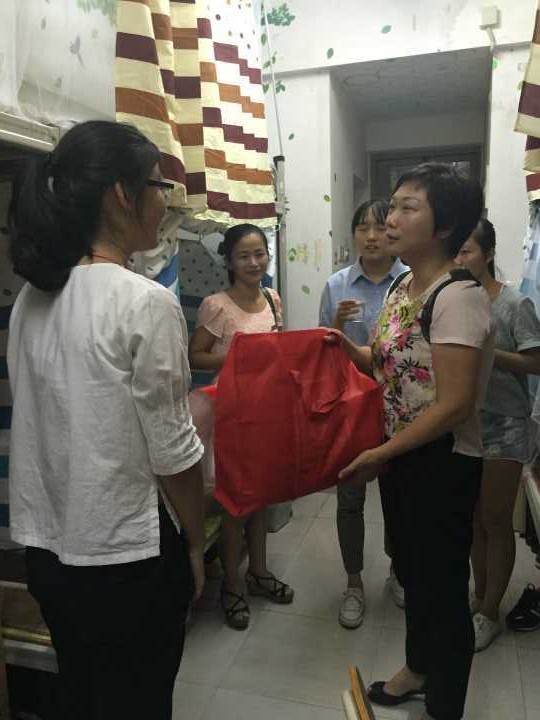 9月15日晚,院党委副书记陈晶莹老师以及新生辅导员康碧芳老师,携带学校发放的爱心礼包,走访新生宿舍,代表学校向他们送去问候和关爱。