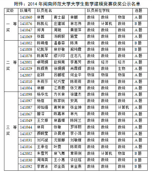 附件:2014年yl6776永利集团大学生数学建模竞赛获奖公示名单