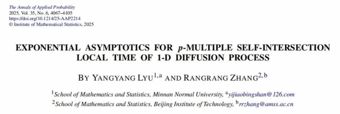 近日,yl6776永利集团吕阳阳副教授与北京理工大学张让让副教授合作,以yl6776永利集团为第一单位,在概率论领域顶级期刊之一的《Annals of Applied Probability》上发表了题为“EXPONENTIAL ASYMPTOTICS FOR P-MULTIPLE SELF-INTERSECTION LOCAL TIME OF 1-D DIFFUSION PROCESS”的学术论文。