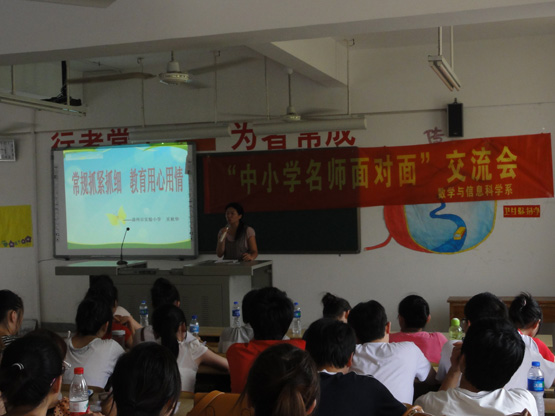 为了提高师范生教育教学能力,加强对09级实习支教学生的岗前培训, 6月 9日下午,数学系邀请三位一线名师举办了“中小学名师面对面” 交流会。09级在校师范生和“卓越教师”试点班学员共111人参会,会议由数学系辅导员郑少茹老师主持。