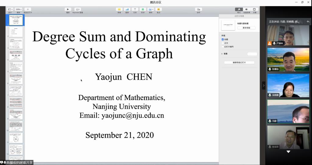 应我院邀请,9月21日下午,南京大学陈耀俊教授在腾讯会议作了题为《DegreeSum andDominatingCyclesof a Graph》的报告。相关师生聆听了此次报告,报告由卢福良教授主持。