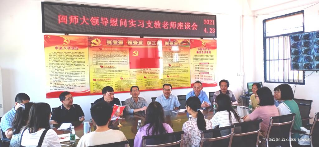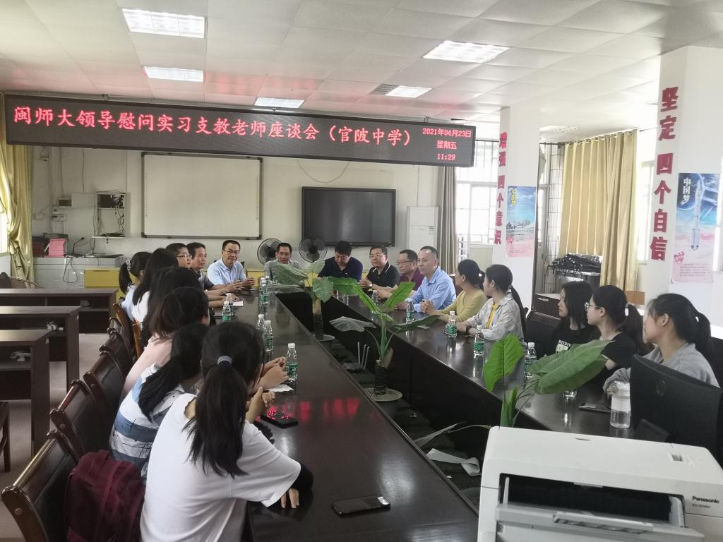 林梦雷院长率调研组一行来到诏安霞葛中学、官陂中学、四都中学及云霄常山中学看望实习生,鼓励同学们抓住实习重要时机,锤炼教学能力、提升综合素质。调研组一行还就农村师资队伍的现状及进一步推进教学实习基地建设、提升农村教育教学质量和水平,实现城乡教育的均衡发展,促进教育扶贫和乡村振兴等与诏安县教育局、诏安县教师进修学校和相关中学进行了深入的交流和探讨。