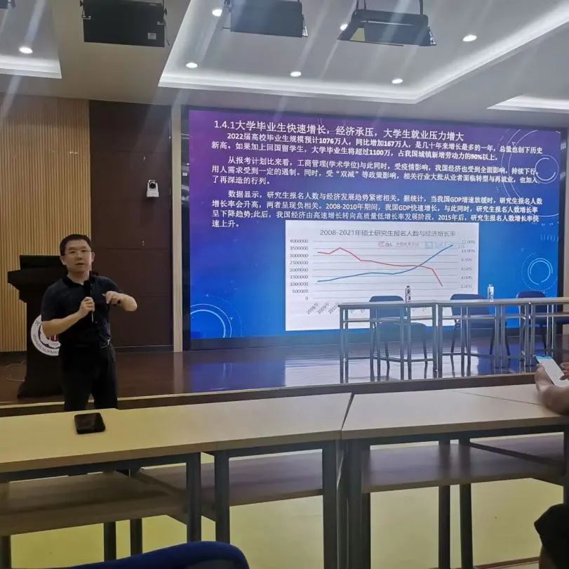 沙龙伊始,首先,胡副书记对今年毕业生就业形势进行通报,并就升学及二战考研的利弊进行分析,接着从宏观上对近年来的考研形势进行研判,指出研究生报名人数持续增加,报考专业硕士研究生的人数已逐渐超过学术型硕士。其次,胡副书记就考研院校选择、考研复习规划等方面进行指导。最后,胡副书记总结了我院2022届毕业生考研情况,提醒同学们要认真借鉴学长学姐们的宝贵经验,走好考研路。