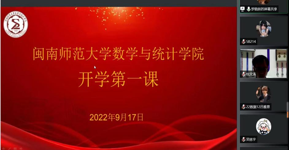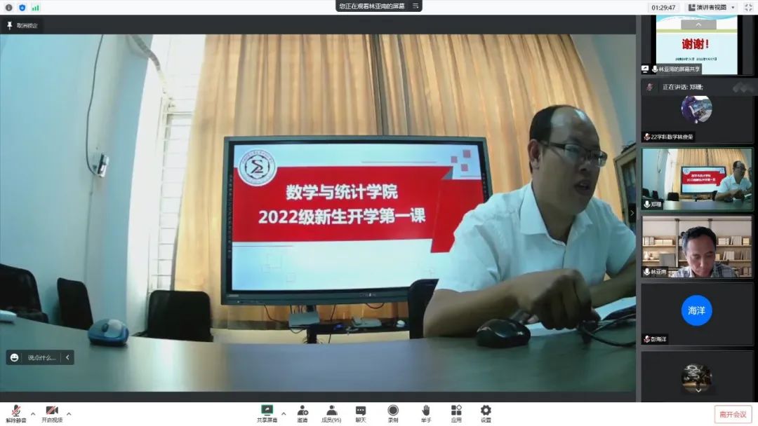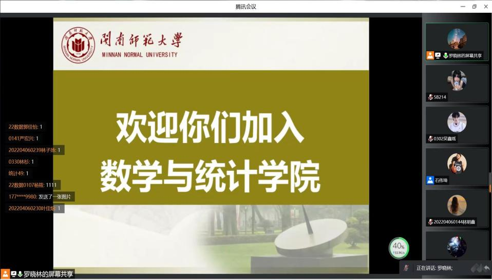 首先,党委副书记胡海智老师对2022级新同学的到来表示热烈的欢迎,希望同学们自觉肩负使命,响应时代号召,牢记习近平总书记的嘱托,争做复兴栋梁,勇当强国先锋。其次,校友包文涛主讲“万物皆数,花时可期——浅谈大学数学学习生活的规划与思考”、郑涛主讲“稳扎稳打,步步为营,走好大学生涯每一步”。再次,李凯铃分享她的大学学习生活,为2022级新生树立了良好的榜样,引导其正确规划大学生活 ,明确奋斗目标,将自己的理想与祖国的前途紧紧相连。