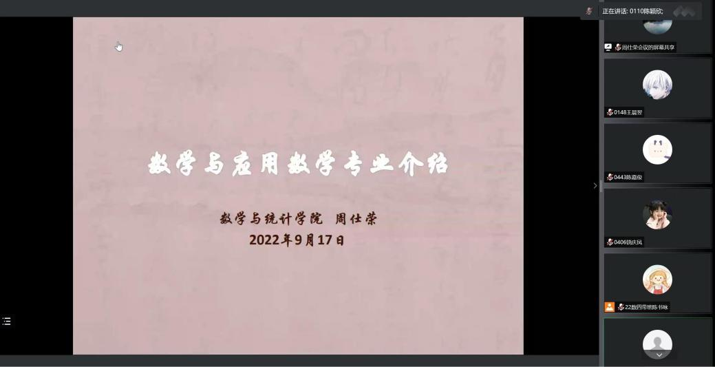 研究生新生专业认知教育分为学科教学(数学)、概率论与数理统计、数理经济与数理金融、应用统计、计算数学、应用数学、运筹学与控制论专业七场。周仕荣、施建华、付志慧、王晓峰、曹炜、卢福良、陈锦坤七位教授分别担任主讲人,教授们分别从专业培养方案、师资力量、主要课程、研究方向等进行详细介绍,帮助研究生新生对所学专业有一个深入的认识。此外,周仕荣教授还向2022级研究生们分享了“如何学习”,帮助研究生新生明确学习目标、快速适应研究生新生活。最后老师寄语同学们一定要求真务实做事情、脚踏实地做学问。