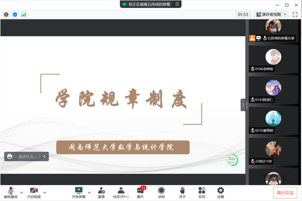 9月17日下午,2022级辅导员石伟琦老师在线上组织新生开展学校、学院规章制度学习。石伟琦老师向2022级新生介绍了学校、学院各类规章制度。他强调了认真学习规章制度的重要性,要求同学们严格遵守学校的规章制度。同时,他希望全体新生尽快在学习方法、生活方式等方面完成角色转变和调整,适应新环境、融入新集体、投入新生活,做到科学规划、自我管理养成良好的学习和生活习惯,刻苦学习、努力奋斗。