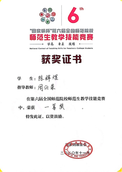 党员导师周仕荣指导的本科生获“第六届全国师范院校师范生教学技能竞赛一等奖”