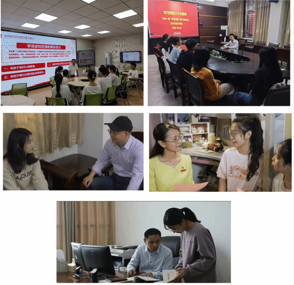 “三位一体”党员导师定期组织开展政治理论学习,进行理想信念渗透教育。先后开展了“三严三实”专题教育、“两学一做”学习教育、党的群众路线教育实践活动、“不忘初心、牢记使命”主题教育、“‘三位一体’党员导师以百个党史故事与学生共筑初心梦”“追忆红色经典,传承红色基因”“我为学生办实事,党员先锋在行动”“温书迎考,诚信考试”“学习党的二十大精神”等主题系列活动。通过交流、讨论、实践服务等方式,师生共同学习先进理论知识,在加强学生思想教育的同时,把专业素质高、入党动机纯正的学生吸引到党组织来。
