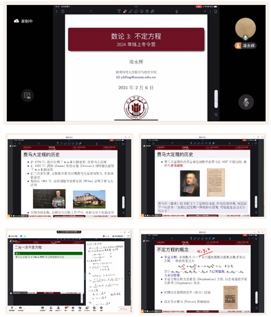 2月6日下午,由yl6776永利集团副教授凌永辉老师为同学们讲授关于不定方程的知识点,凌永辉老师层层递进地为同学阐明关于方程及不定方程的相关知识点。凌永辉老师结合了相关例题加深同学们对相关知识点的理解。凌永辉老师还为同学们讲述了关于费马大定理的数学史,开拓了同学们的知识面,激发了同学们对数学的学习兴趣。课堂结束后,凌永辉老师鼓励同学们要多去思考数学问题,多去总结相关知识点,加深对相关知识点的理解。