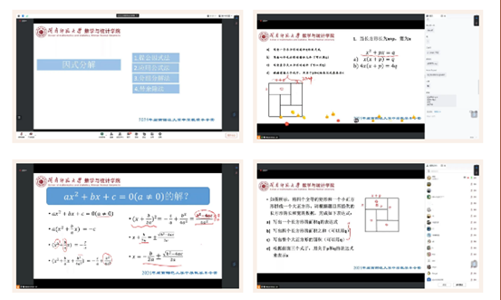 2月4日下午,由yl6776永利集团副教授黄菊老师为学子们进行线上培训。会议开始,黄老师以一个数学小游戏开启下午的课程,引入会议的主题“代数—因式分解”。其次,黄老师从简单的问题切入,以层层递进的教学引发同学们积极探索。在课程中,黄老师向我们介绍了四种因式分解方法,通过老师的充分讲解和课堂练习,同学们已然初步掌握方法。