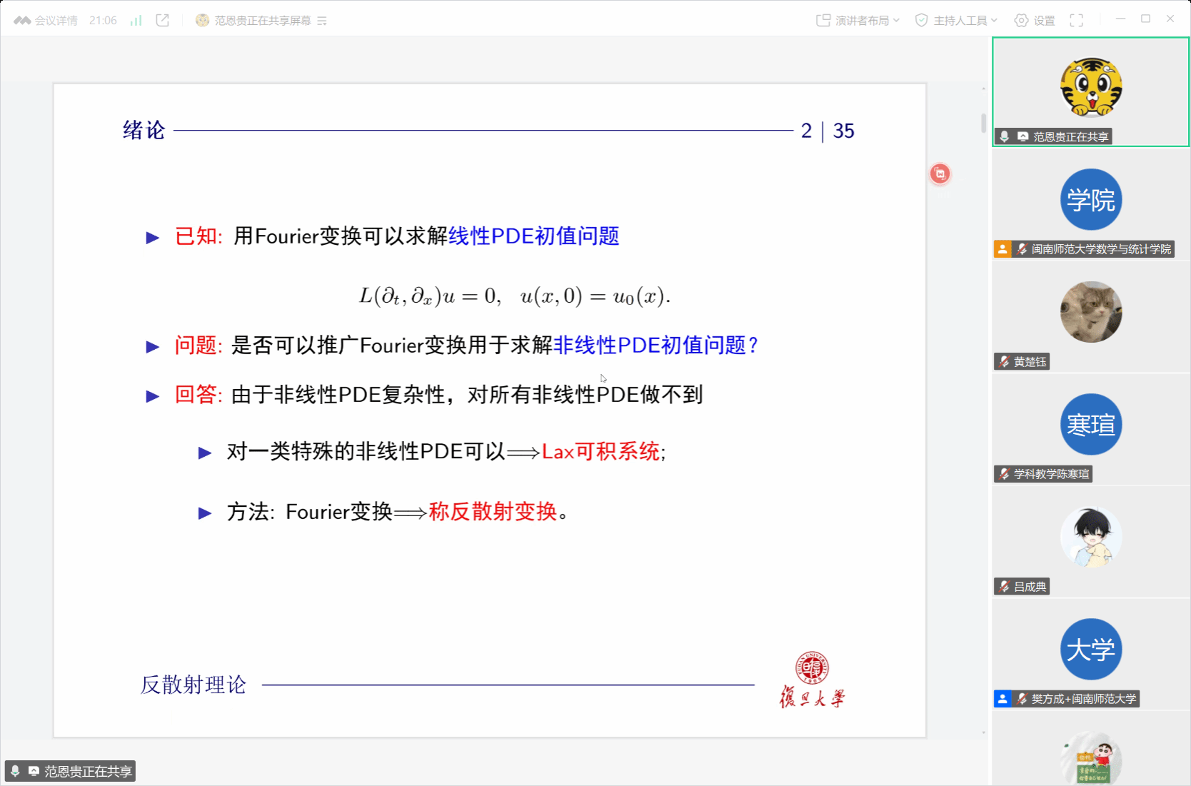 1967年,Gardner、Greene、Kruskal和Miura 发现求解KdV方程快速衰减初值问题的反散射方法,该方法是Fourier变换在非线性可积偏微分方程中的自然推广。在此次讲座中,范恩贵教授综述了反散射理论的产生和发展,并特别分析比较经典反散射方法、Riemann-Hilbert方法和Dbar方法的关键思想、各自优势和应用范围,同时简述了国内外以及复旦团队在反散射理论上的主要工作。