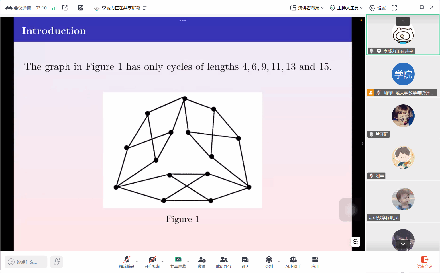 在讲座中,李诚力博士首先为听众介绍了其研究领域的最新成果。在以往的研究中,对于每个最小度至少为k(k≥6)且阶至少为k+2的3-联通非二部图,经过严密的推导与论证,学者们证明了这类图均包含k个连续长度的圈。基于该研究成果,有学者大胆提出猜想:当k=4、5时,该结果同样成立。李博士指出,尽管这一猜想在逻辑上具有一定的合理性,但由于k值的变化会导致图结构的复杂度和分析难度显著增加,想要证实它并非易事。基于此,李博士通过与詹教授的深度合作,构建了新的图论分析模型,运用创新的组合论证方法,经过大量的模拟验证和严谨的数学推导,最终成功证实了这一猜想。