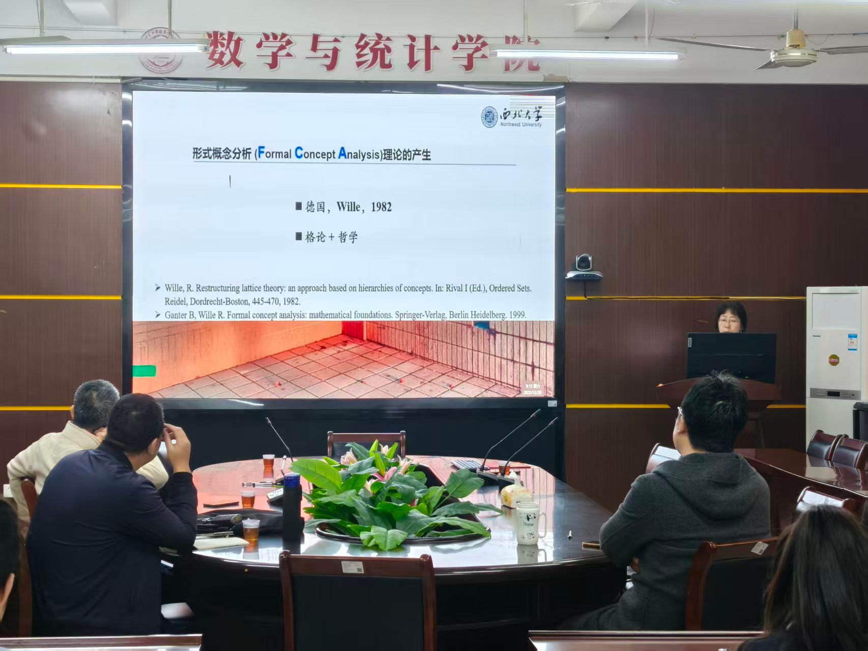 讲座中,魏玲教授围绕形式概念分析中的“概念约简”展开系统阐述。魏玲教授首先回顾了形式概念分析的基本框架,指出其通过形式背景提取形式概念,实现对哲学中“概念”这一思维单元的形式化建模,并构建概念格这一知识可视化与结构分析的核心工具。在此基础上,她进一步引出“概念约简”这一重要研究方向。魏玲教授强调,概念约简是继属性约简之后的另一种重要约简视角,其核心是在保持形式背景中所有原始二元关系不变的前提下,有效减少概念数量,从而克服属性约简可能导致的信息丢失问题。她在报告中系统介绍了概念约简思想的形成背景、关键方法与主要研究成果,并进一步延伸探讨了其他相关约简思想及其理论联系。此外,魏玲教授结合当前理论研究前沿,指出了该领域未来可深入探索的若干开放问题,为在座师生提供了丰富的研究启示与思路借鉴。在交流环节,魏玲教授同现场师生围绕概念约简在实际应用中的挑战、形式概念分析与其他知识表示方法的关联等问题展开了深入讨论,现场学术气氛热烈。