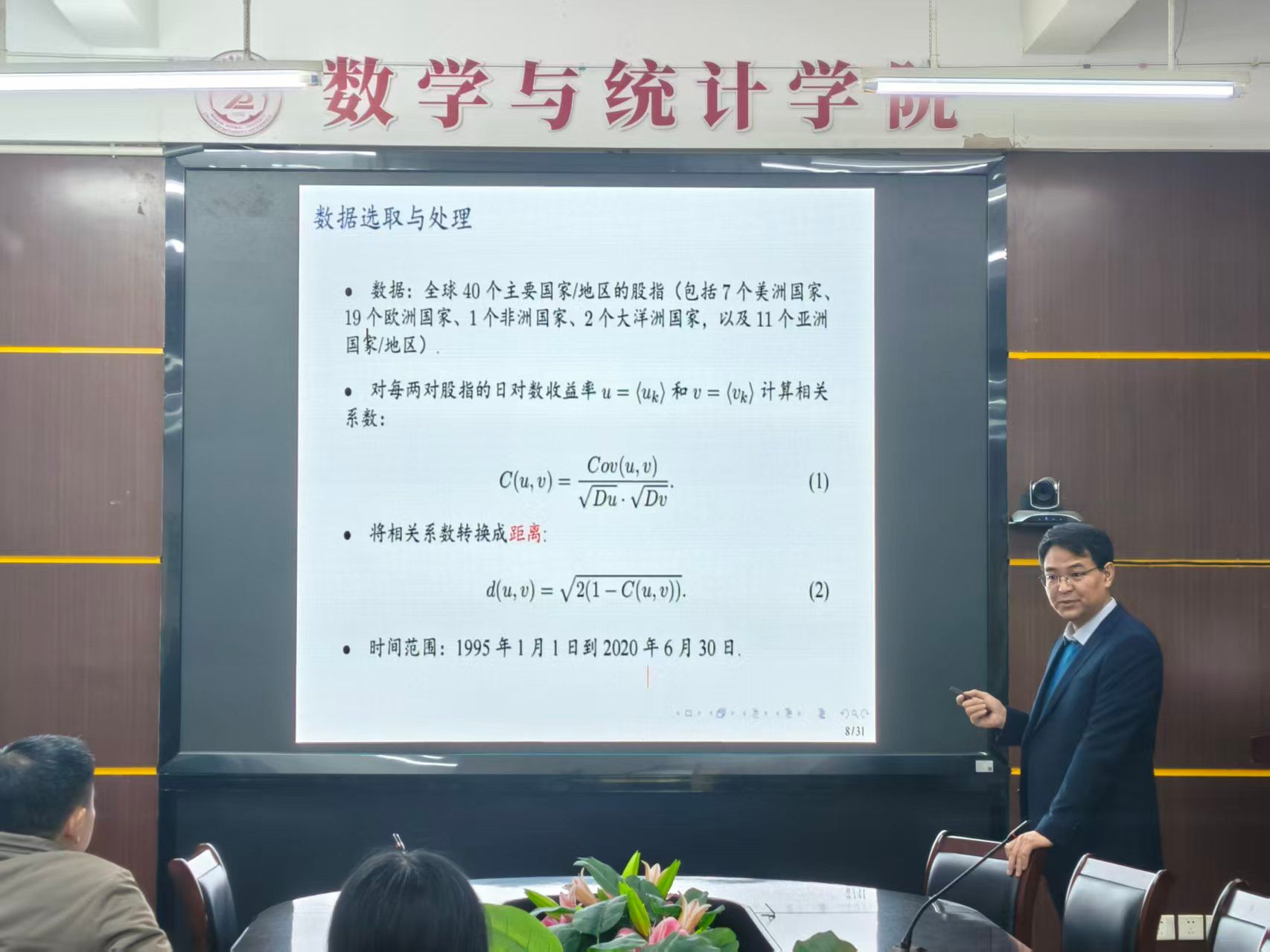 讲座伊始,郭洪峰教授结合全球化背景,点明了全球股市风险联动研究的现实意义。他指出,当前全球股市关联性日益增强,局部市场风险易通过联动效应扩散形成系统性风险,传统线性分析方法难以精准捕捉股市联动的非线性、非平稳特征,亟须创新研究方法破解这一难题。随后,郭教授围绕讲座核心主题,系统阐述了研究的核心思路与技术路径。他介绍,研究首先通过拓扑数据分析挖掘全球股市联动特征,借助Vietoris-Rips复形构建股市数据拓扑结构,提取持久条形码识别临变状态关键信号——当条形码中高维拓扑特征持续长度突变时,即提示市场可能进入风险临变阶段。在此基础上,依托复杂网络理论,以各国股市为节点、市场间收益率相关系数为边权重构建加权无向网络,通过节点度、聚类系数、介数中心性等拓扑度量,深入分析全球股市关键时间点的风险传导特征,精准定位风险传导的核心枢纽市场。
