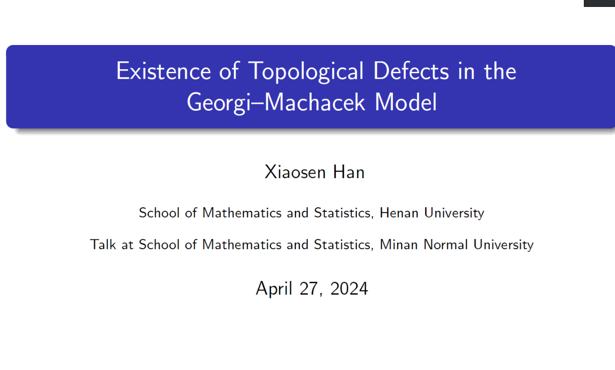 报告中,韩小森教授给我们报告了一些拓扑缺陷在george - machacek模型中的存在性结果。我们首先回顾了经典的阿贝尔-希格斯模型和相关结果。然后给出了george - machacek模型及其主要存在性结果。最后对存在性结果的证明作了简略的说明。