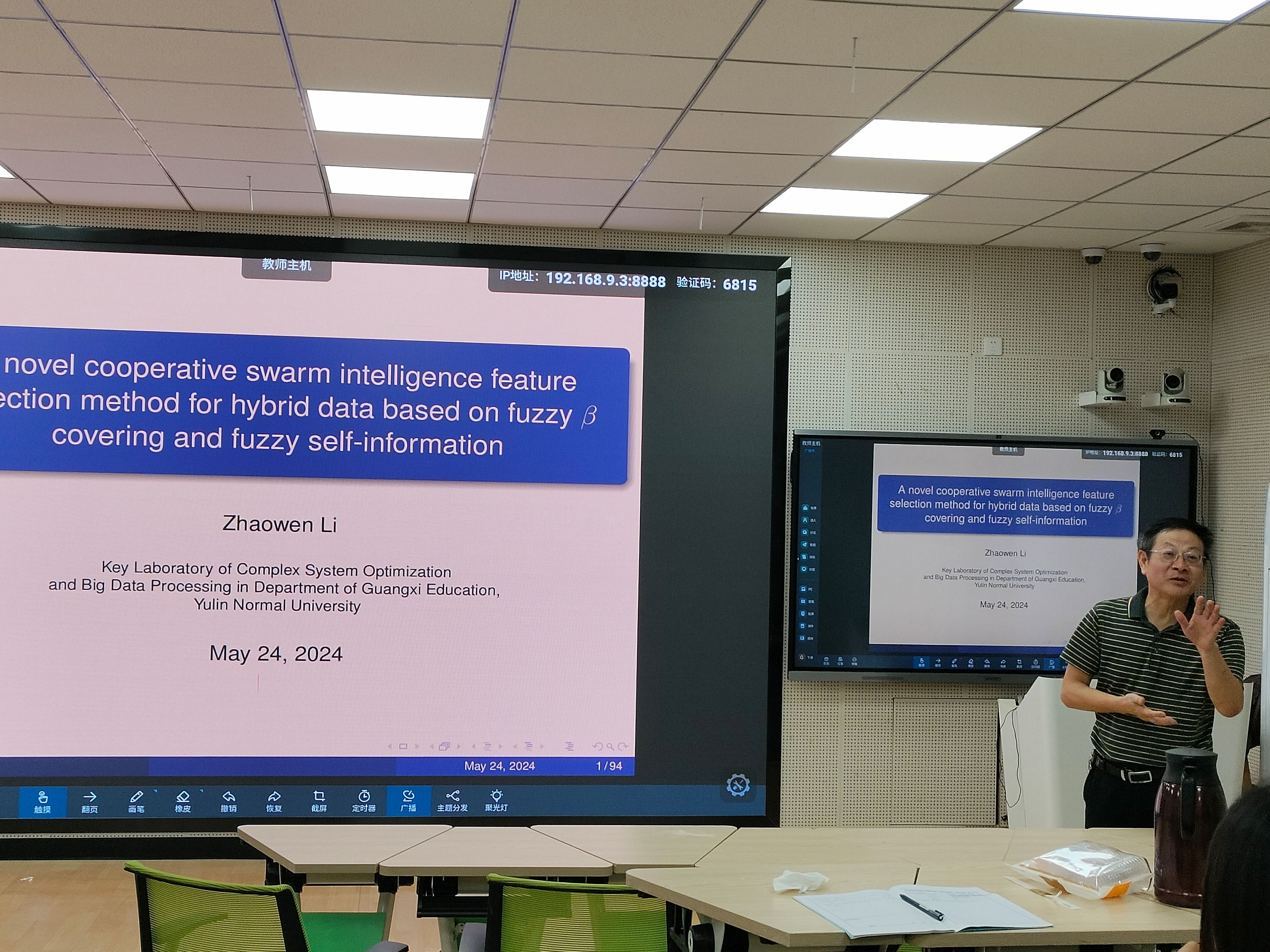 应我院邀请,5月24日上午,玉林师范大学李招文教授在砺志楼114作了题为《一种基于模糊β覆盖和模糊自信息的混杂数据的协同群智能特征选择方法》的报告。相关师生聆听了此次报告,报告由林国平老师主持。