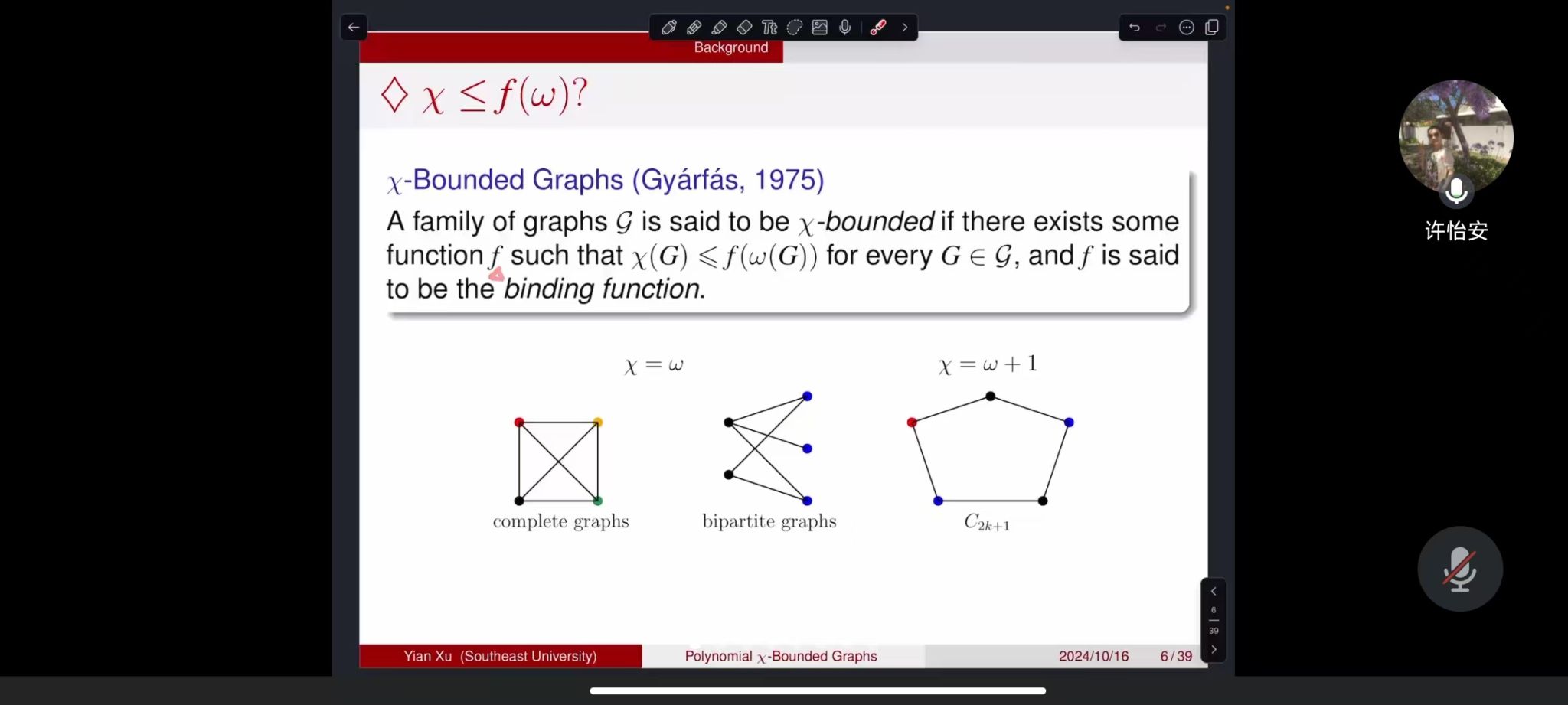应我院邀请,10月16日上午东南大学许怡安副教授在腾讯会议作了题为《Polynomial chi-Bounded Graphs and Holes》的报告。相关师生聆听了此次报告,报告由兰开阳老师主持。