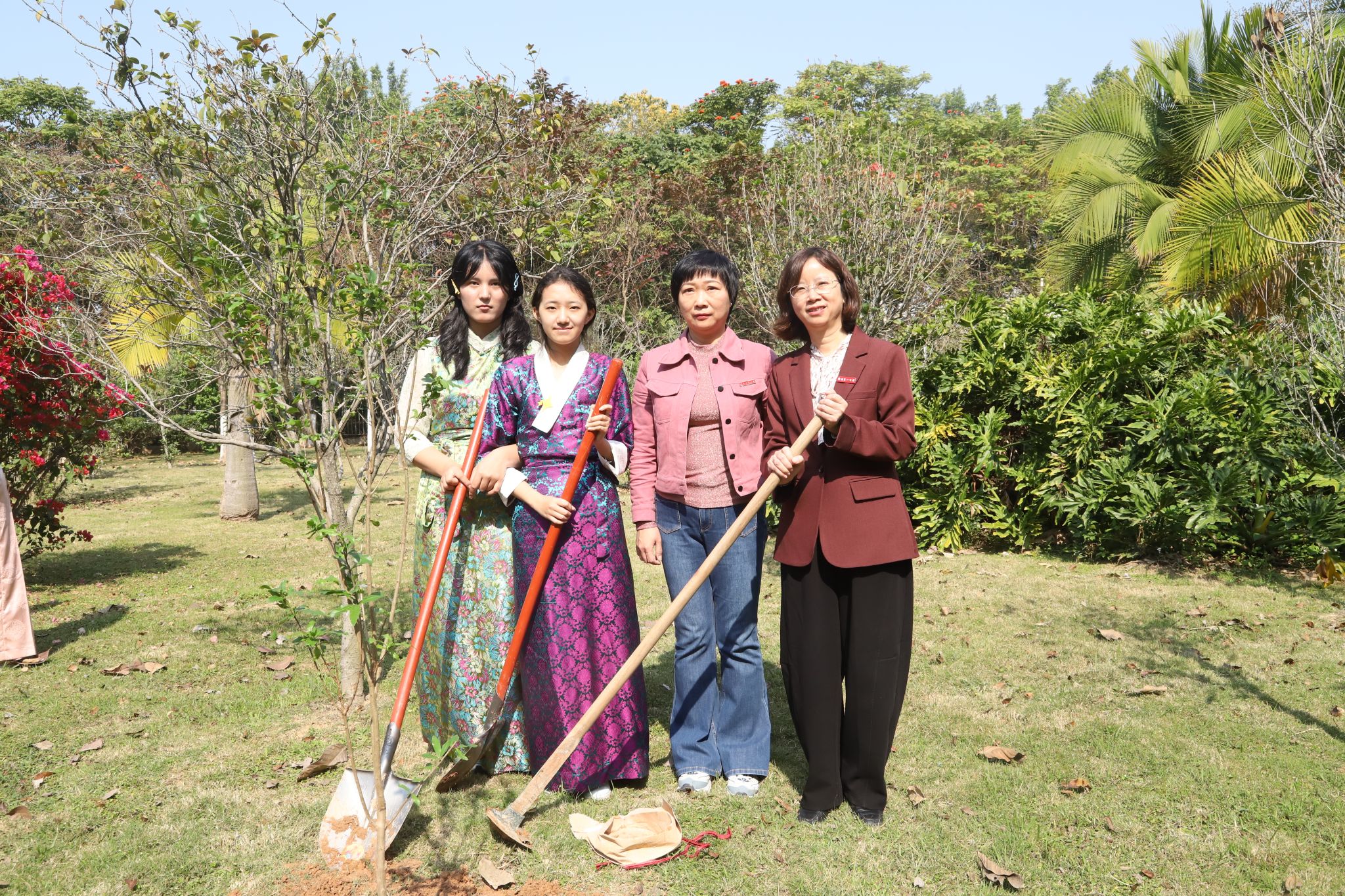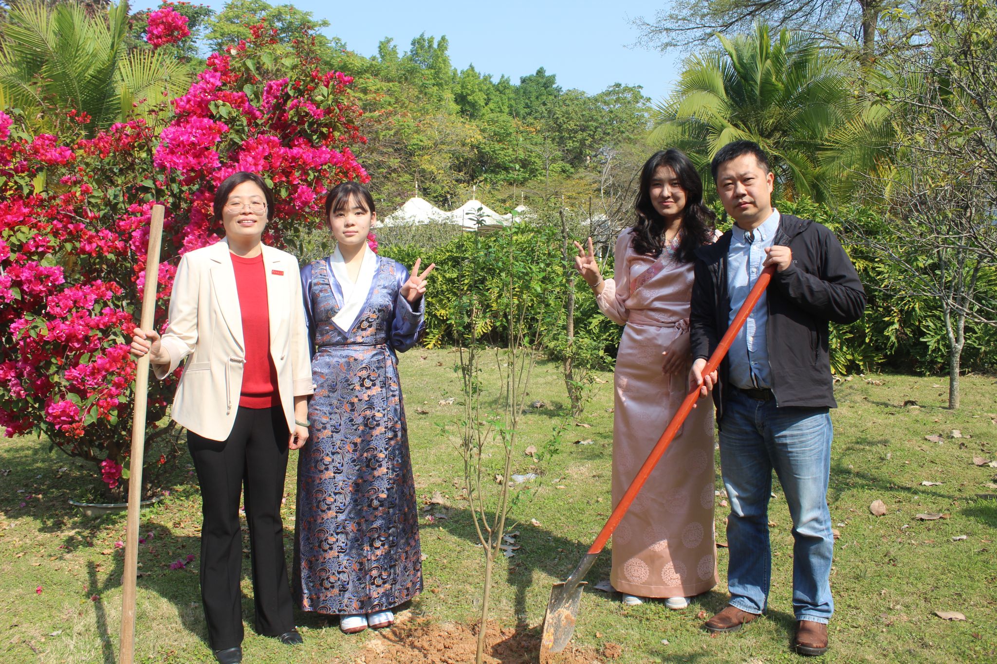 根脉相连共成长,枝叶相倚同筑梦。两校师生挥锹培土,在闽南师大校园栽下8棵象征民族团结的石榴树。石榴树扎根闽南红壤,象征各民族像石榴籽般紧密相连;两校师生共培沃土,寓意各民族优秀文化在交流中交融创新。陈晶莹与杨娟共同为“同心林”景观石揭幕,标志着两校铸牢中华民族共同体意识的合作迈出新步伐。爱心助教学生代表林晖与西藏班学生普布卓玛激动地表示:“这是8棵象征“团结、繁荣、希望”的石榴树,见证着闽藏学子的深厚情谊!”