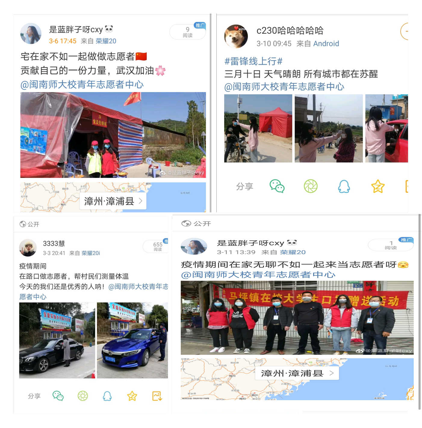 打造志愿服务平台+社团。为弘扬向“上”向“善”的雷锋精神,落实“奉献、友爱、互助、进步”的志愿者精神,今年3月,我院青年志愿者中心协同各团支部开展“疫情防控,义勇当先”志愿服务活动和“雷锋线上学,雷锋线上行”活动。旨在倡导各班同学积极参与到各自所在街道、社区的抗疫情志愿服务活动中。在活动过程中,涌现出大量“平凡天使”,他们在一线为村庄站岗、为防疫捐款捐物、为村民讲解相关抗疫知识等,引领学生志愿服务意识不断增强。