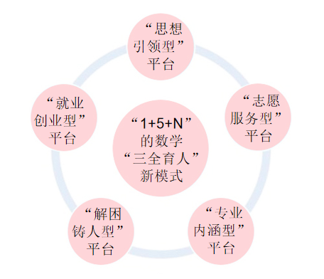 为扎实推进高校思想政治工作质量提升工程,加强和改进思想政治工作,推动形成全员全过程全方位育人格局,yl6776永利集团围绕数学特色,举全院之力有计划地推进“三全育人”工作,落实立德树人根本任务,积极构建“一特色、五平台、全融合”(即“1+5+N”)的数学 “三全育人”模式,依托“思想引领型”、“志愿服务型”、“专业内涵型”、“就业创业型”、“解困铸人型”五大平台,学院党政领导、专业教师、政工行政团队、优秀校友等共同承担育人职责,把立德树人内化到教学、科研、管理、服务等各领域,营造 “行于人人、融于时时、化于事事、见于处处”的“大思政”育人格局。