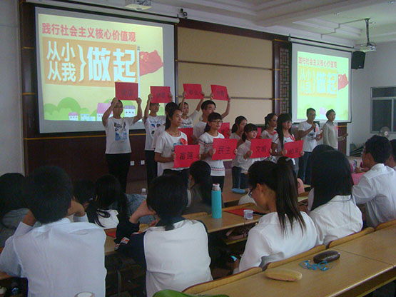 开幕式在观摩历届党团活动的风采展中正式启动,随后14级各班团支部通过各具特色ppt和视频展示生动全面展示了他们在近两个月期间亲身学习和践行社会主义核心价值观的概况,同时他们还通过现场朗诵、小品、合唱、宣誓、签名等生动的形式诠释他们眼中的社会主义核心价值观,以平民化和大众化的视角,通俗易懂的语言把社会主义核心价值观24个字内涵解读得入脑入心,在场同学产生了思想共鸣,赢得了他们阵阵掌声。