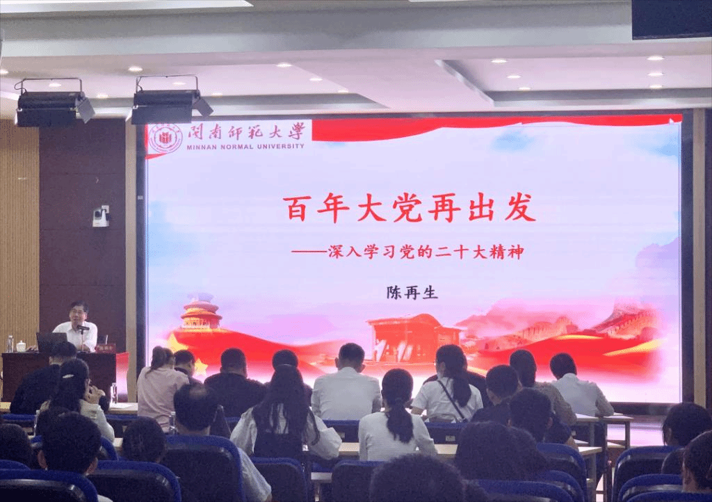 本次培训班第一堂课,由马克思主义学院院长陈再生教授为在座学员讲授题为《百年大党再出发—深入学习党的二十大精神》的党课。