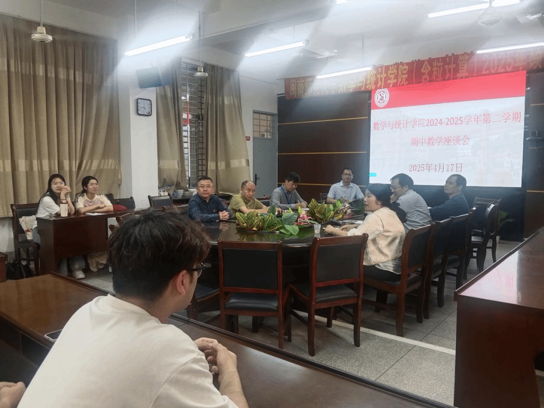 加强学院教学管理,深入了解教师教学情况与学生学习需求,我院于2025年4月17日下午在砺114召开2024-2025学年第二学期期中教学座谈会。学院党委副书记胡海智、分管教学副院长周仕荣、校督导组委员曾剑斌、院督导组长柳成林,数据计算及应用专业负责人王晓峰、数学与应用数学专业负责人黄菊、统计学专业负责人李气芳、教学秘书康碧芳、各班代表及教学信息员参加座谈。