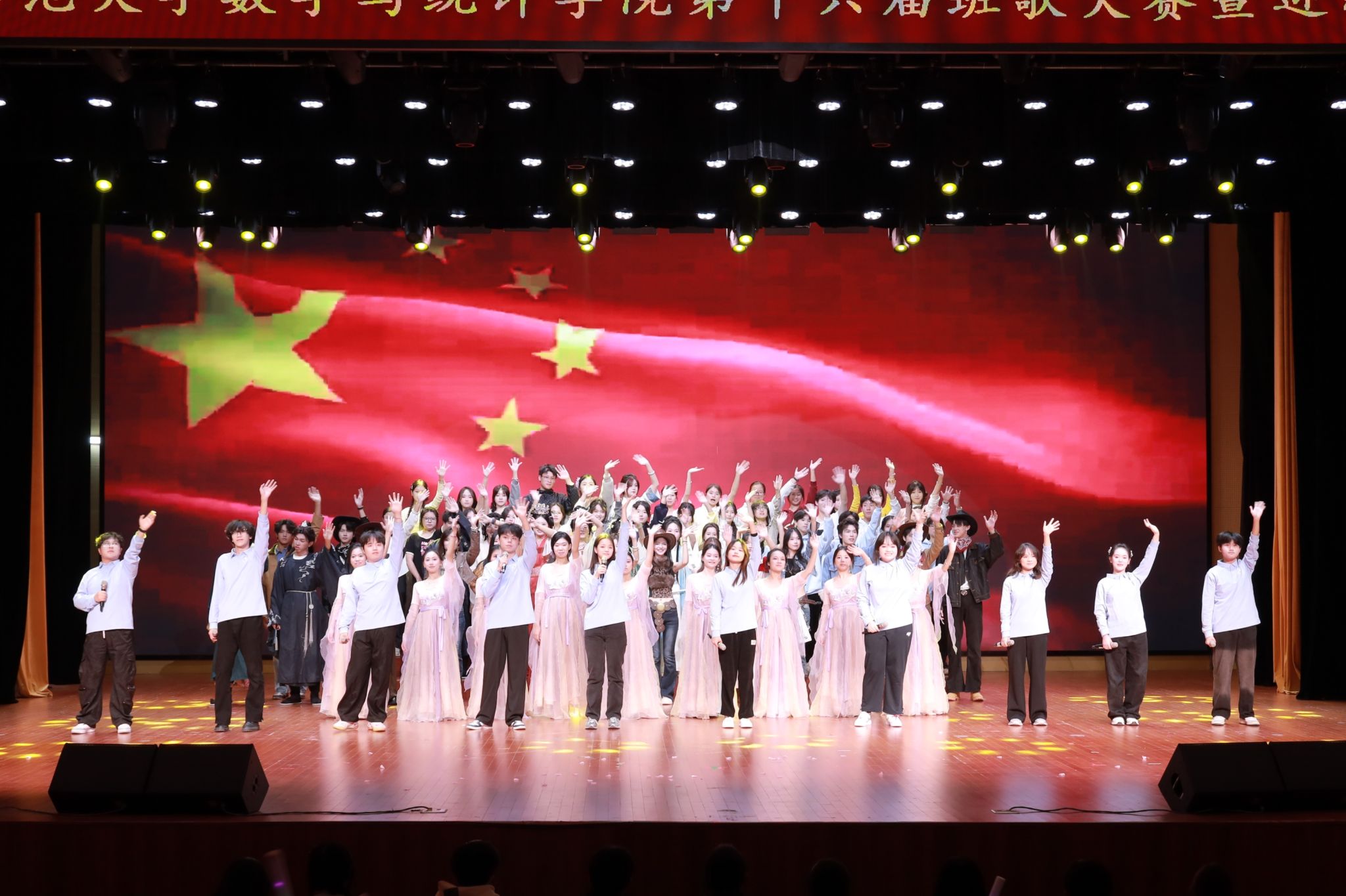 本次班歌大赛以“回望·烽火不熄,热血铭心”、“担当·铁骨不折,吾辈自强”、“奋进·丹心昭汉,再续荣光”三大篇章为主线,层层推进,展现数统学子在历史回响中汲取力量、在时代召唤下勇担使命、在奋进道路上续写荣光的坚定信念。各参赛班级精神饱满、气势如虹,用铿锵的旋律与昂扬的姿态,彰显出青春的厚重与力量。他们用歌声传递不忘历史的清醒,表达强国有我的决心,共同为民族复兴的伟大征程贡献青春笔墨。