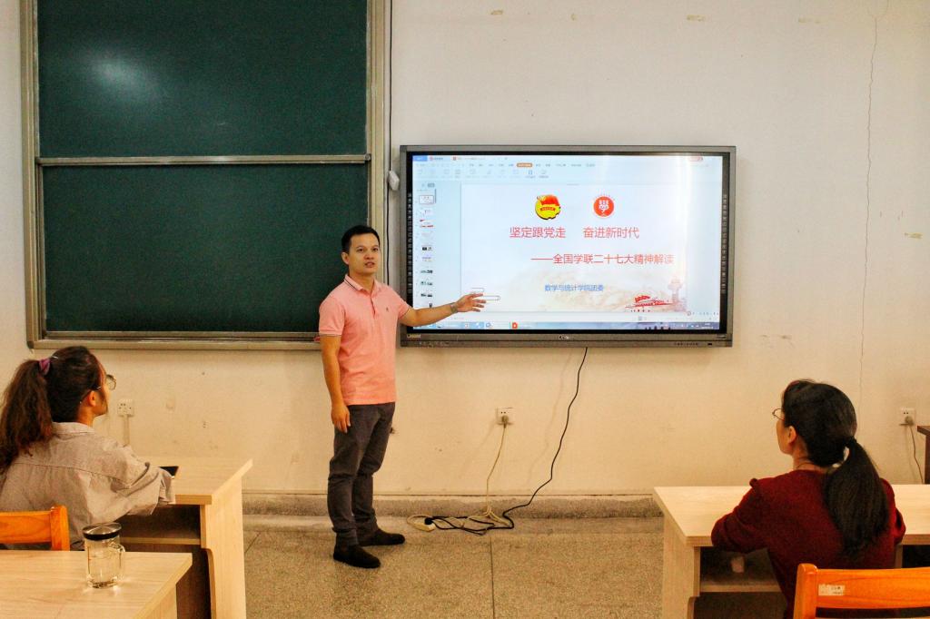 会议首先由郭彬彬老师对全国学联二十七大会议精神进行解读。郭老师围绕学联学生会的前世今生,从深化改革和时代使命对全国学联二十七大精神进行全面解读。他指出,广大青年学子要谨记习近平总书记的殷殷关怀与敦敦教诲,坚定理想信念,培育高尚品格,练就过硬本领,敢于创新创造,矢志艰苦奋斗,担负起时代的重任。