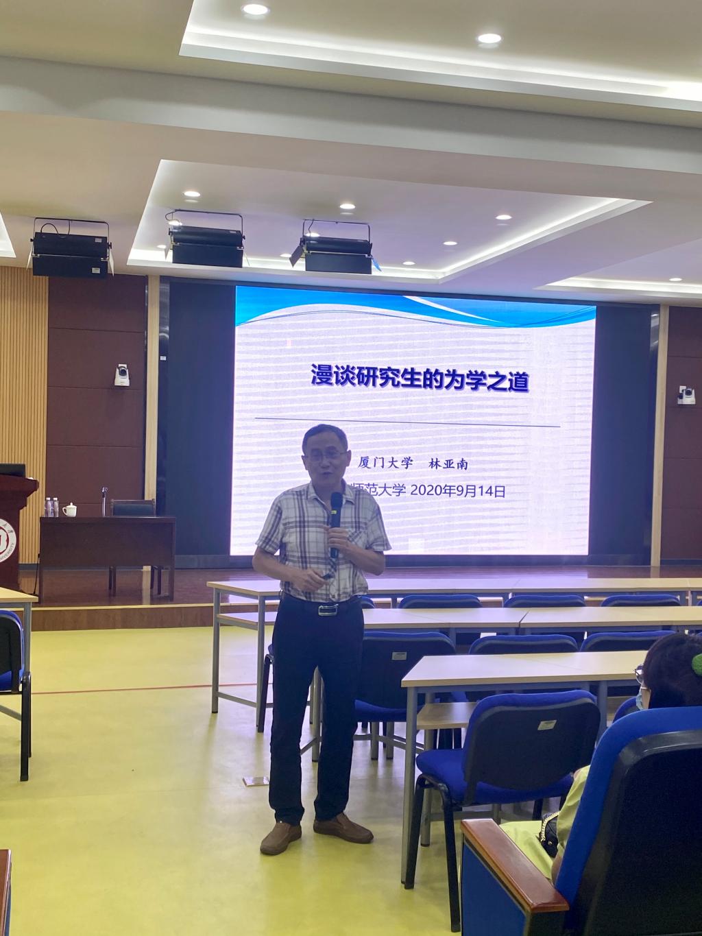 9月14日,厦门大学林亚南教授应邀在砺志楼120报告厅为我院2020级研究生新生们分享“漫谈研究生的为学之道”主题讲座,讲座由学院李建喜副院长主持,学院73名研究生新生参加。
