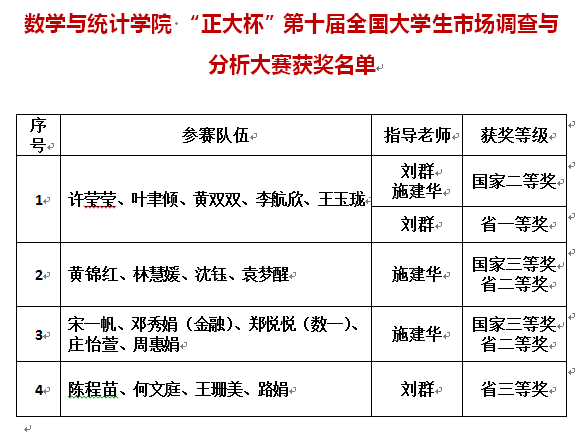 近日,由教育部高等学校统计学类专业教学指导委员会与中国商业统计学会共同主办的“正大杯”第十届全国大学生市场调查与分析大赛圆满结束。在本届市场分析调查大赛中,yl6776永利集团学子表现优异,在施建华、刘群老师的指导帮助下,四支队伍荣获国家级、省级荣誉。
