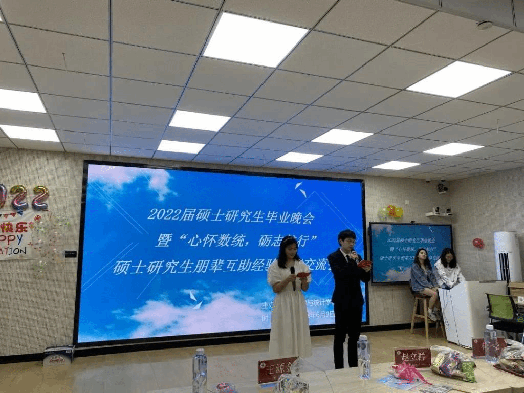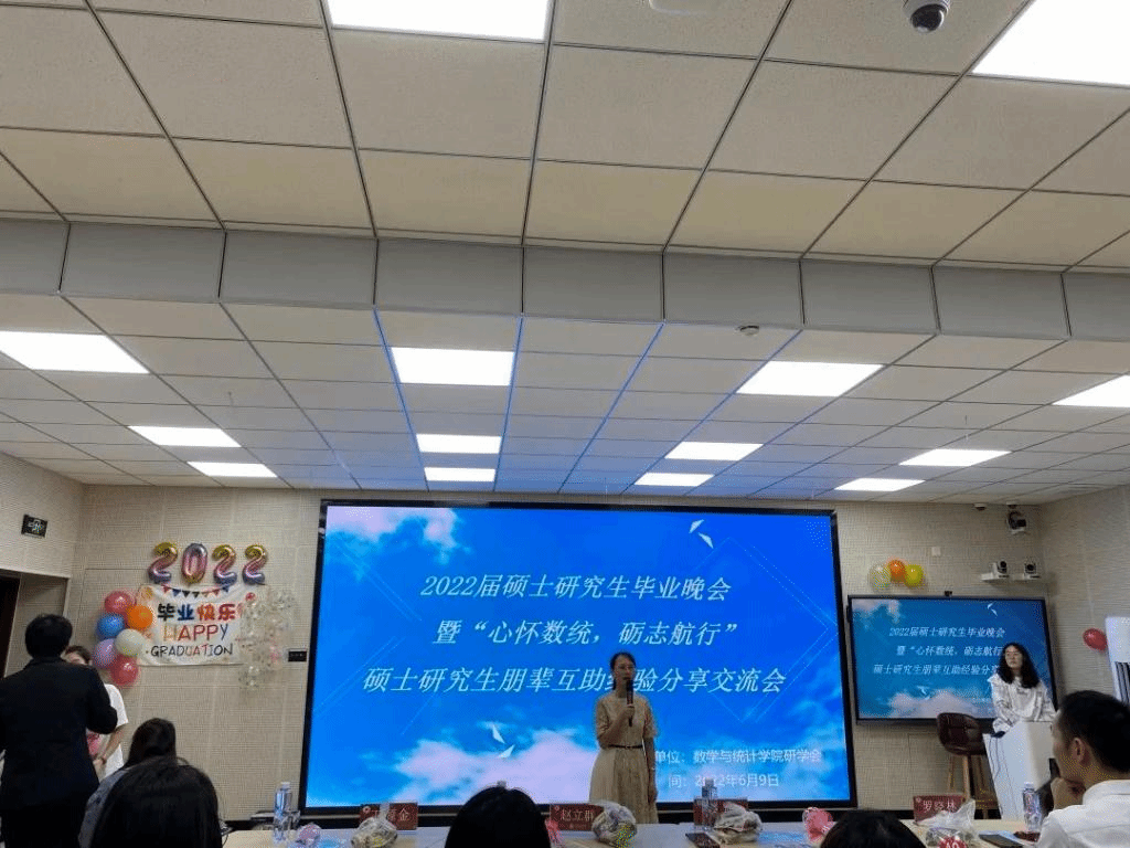2022年6月9日19:00,yl6776永利集团于砺志楼131举办了2022届硕士研究生毕业晚会暨“心怀数统,砺志航行”硕士研究生朋辈互助经验分享交流会,学院党委副书记林晓老师,团委书记罗晓林老师,辅导员郑珊老师与毕业生们欢聚一堂,共同奏响毕业的骊歌。