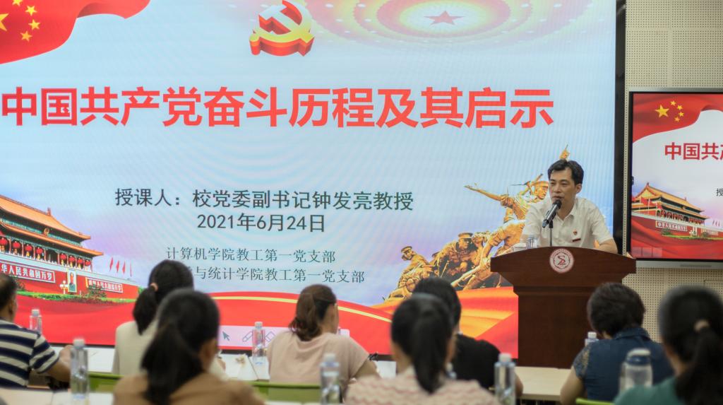 6月24日晚上,校党委副书记钟发亮教授在砺志楼131教室为计算机学院教工第一党支部、yl6776永利集团教工第一党支部全体党员作题为《中国共产党奋斗历程及其启示》的专题党课。党课由yl6776永利集团教工第一党支部书记周仕荣教授主持。